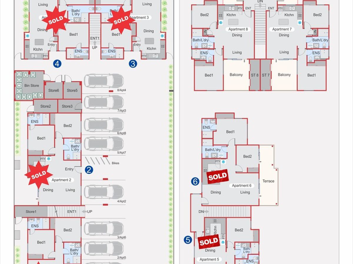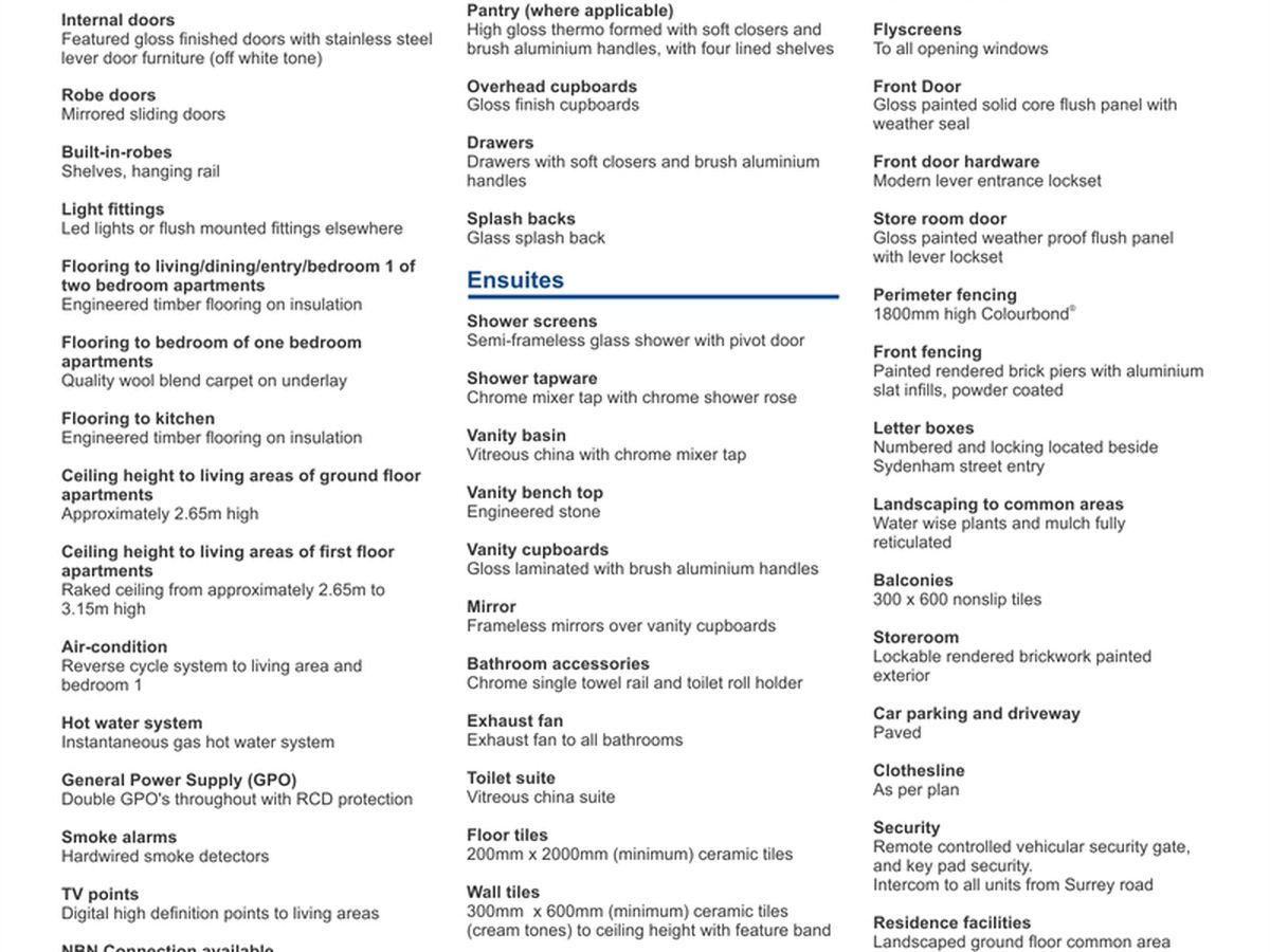 These quality designed apartments offer two bedrooms with two bathrooms, dining, lounge and a modern kitchen with engineered stone tops, soft close drawers, front loader washer, dishwasher and trough in laundry cupboard.